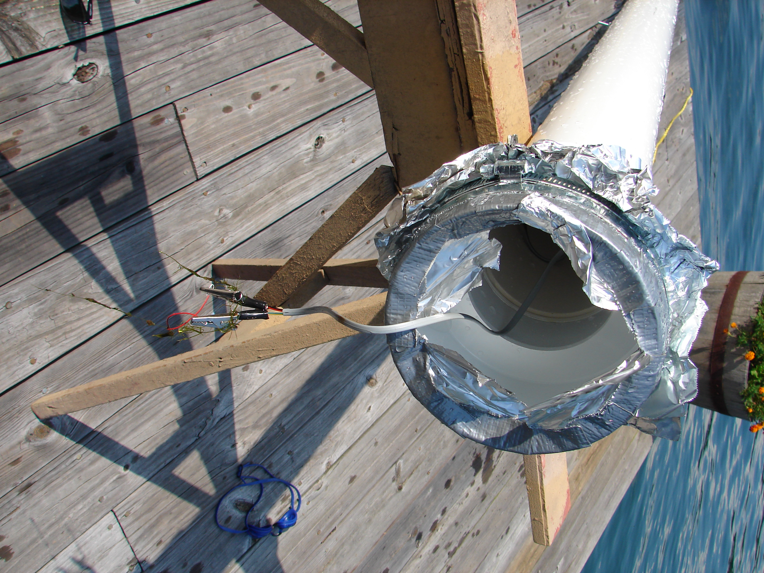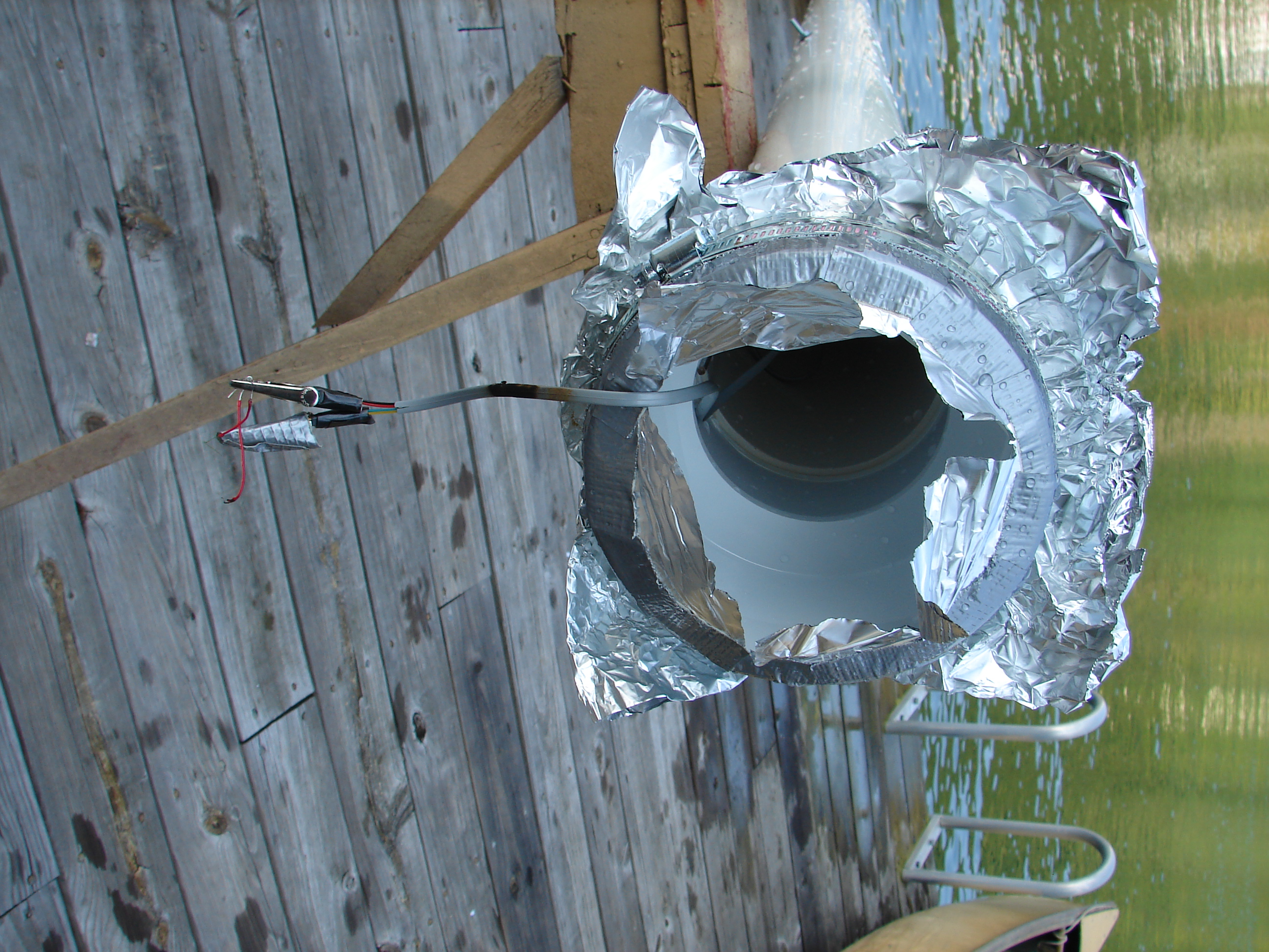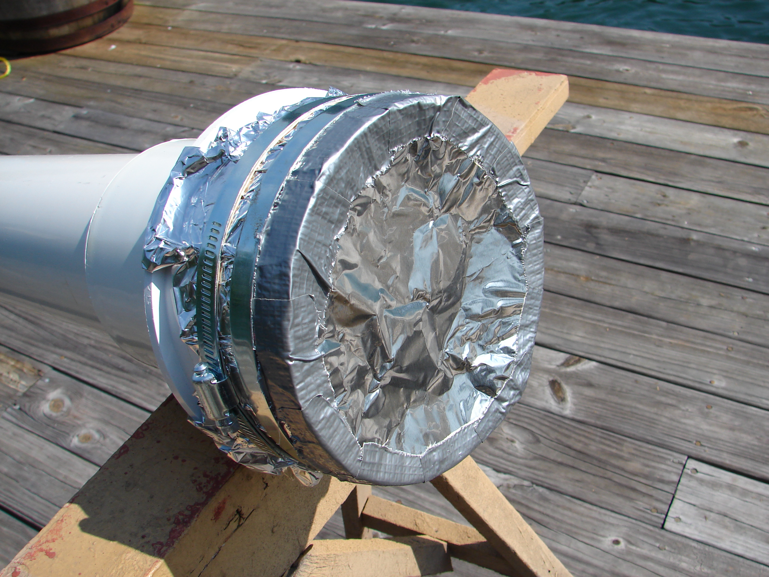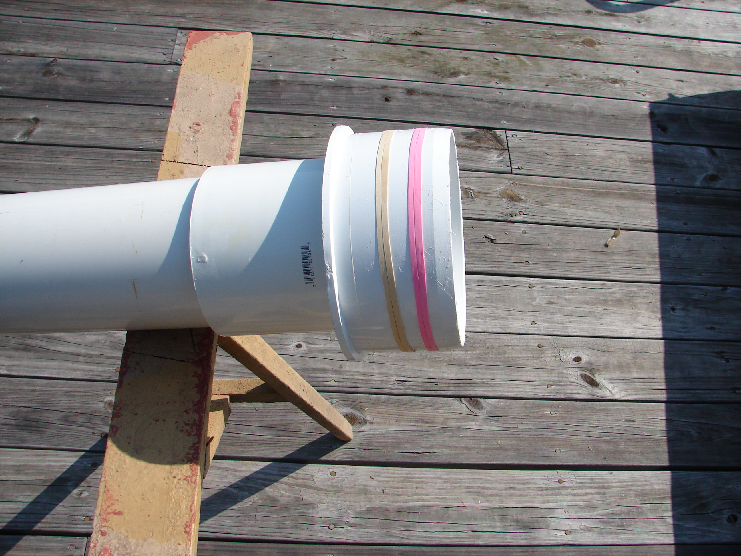 The launch tube was a 10 foot 4 inch diameter pipe, with a 4 inch to 6 inch bushing attached to the top, to increase the area of foil. We used a double layer of heavy-duty kitchen aluminum foil. The two layers were sealed together using rubber cement. The foil was attached with dual hose clamps+rubber band assemblies. The edge of the foil, where it met the PVC pipe was reinforced with duct tape to avoid leaks in that vulnerable area. This marks (as far as I know) the introduction of a new engineering material: Duct Tape Reinforced Aluminum Foil.