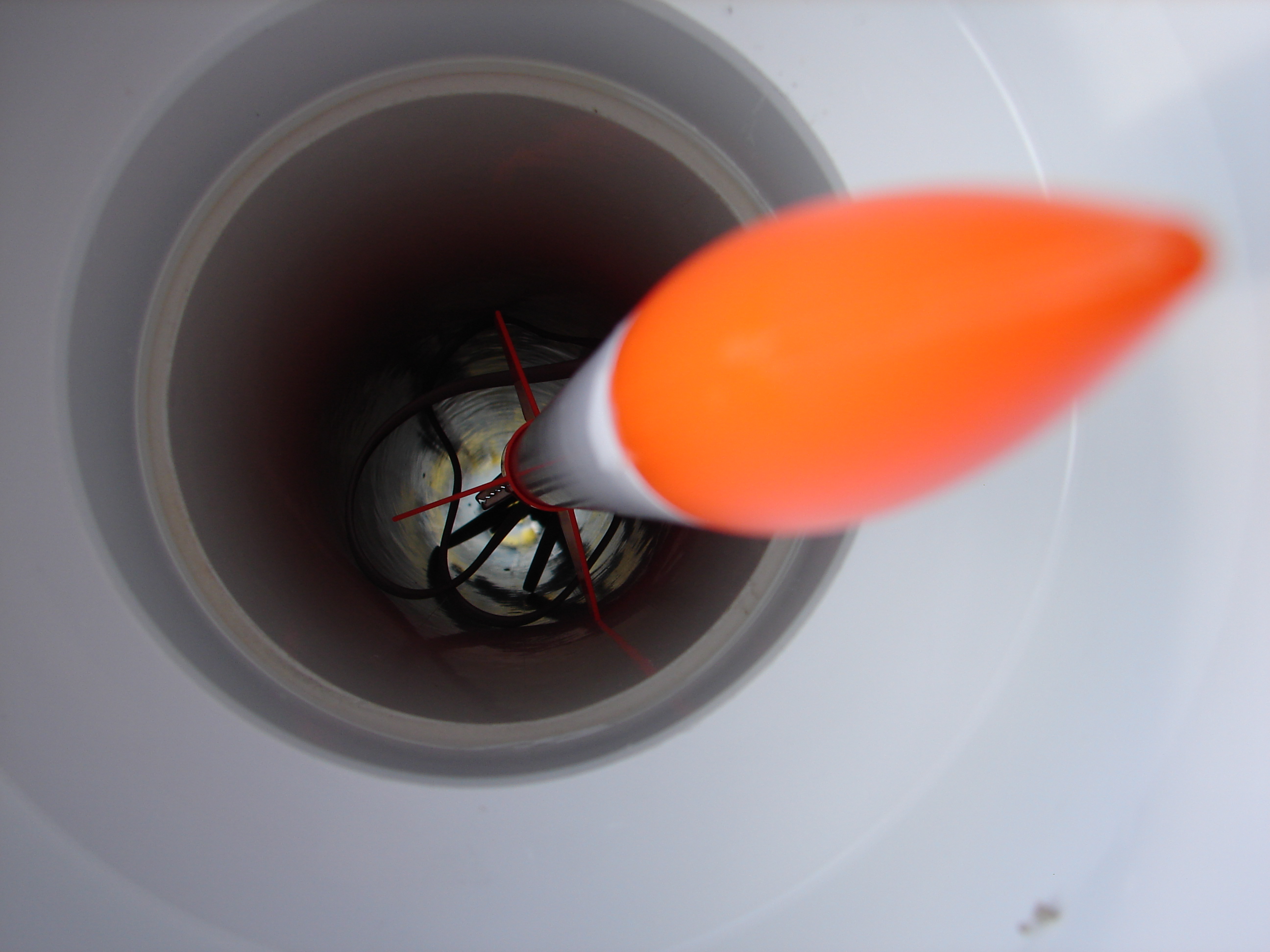 The guide rod assembly consisted of a 4 foot steel wire with one end looped into a "U" around a bolt. A pair of washers and nuts firmly attached the rod at a 90 degree angle to the bolt. The bolt was then attached to the pipe through a hole drilled in the wall, using rubber washers to get a water-tight seal. The ignition system was 50 feet of waterproof low-voltage landscape lighting wire. This was attached to the launch tube by tying it to the bolt anchoring the guide rod. Lightweight telephone cord with alligator clips was used to make the final connection to the igniter. Ignition is powered by a 12volt marine battery.